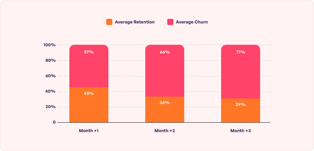- The retention rate in iOS apps is 25.6% one day from download, and 4.3% 30 days after download.